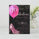This custom invitation features a glamourous 40th birthday party theme on a black background. The phrase "40 & fabulous" is printed across the top in a script font. A large hot pink balloon is placed on the left with "50" printed inside. Glitter lights accent the top and bottom portions. A beautiful band of diamonds is printed below the name of the guest of honour. A pair of shiny pink high heel stilettos are pictured in the bottom left. It's perfect for a birthday, anniversary, or other special occasion.