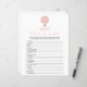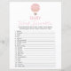 This baby shower word scramble game is perfect for a baby shower or baby sprinkle. This word scramble game features a pink watercolor hot air balloon and coquette bow on the back. You can personalise this design by clicking on "Personalise this template" or if you wish to change the font, colours or arrange the design elements in a different way you can click on "Edit using Design Tool". Answer Key: 1. Diaper 2. Bassinet 3. Bottle 4. Crib 5. Pacifier 6. Changing Table 7. Stuffed Animal 8. Stroller 9. Rubber Ducky 10. Blanket 11. Teether 12. Formula 13. High Chair 14. Mobile 15. Thermometer 16. Baby 17. Milk 18. Booties 19. One-sie 20. Teddy Bear