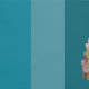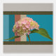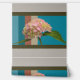 The design features abstract fine art of shades of aqua blue, grey, stone brown, and grey colours along with golden hearts and pink hydrangea flowers - all presented in an elegant striped geometric pattern.