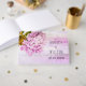 Pink hydrangeas floral wedding guest book. It showcases pink hortensia or hydrangea flowers on pink and purple watercolor background.