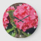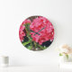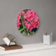 The original photograph by MaeFlowers on this Wall Clock is a closeup of pink hydrangeas and their jagged edged spring green leaves. The central pompom of flower petals almost fills the photo, surrounded by the green leaves and another flower pompom on the side. The clock has white numbers, but these can be deleted if you prefer.