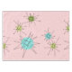 This Pink Iconic Atomic Starbursts Tablecloth (large print) pattern features iconic atomic starbursts. That’s right! The old school, First Lady Pink coloured background with gold speckles is the perfect backdrop for the vibrant turquoise, soothing celery, and kitschy pear green coloured circles. The spots of colour are sporadically placed in various sizes with overlaying black V shaped lines to form the mod sputnik starbursts. Styled after a 1950’s dish pattern, this retro inspired design has everything you need to be truly mid century modern.
