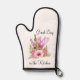 Pink flowers and pink kitchen utensils design on oven mitt and pot holder. Customise the words.