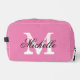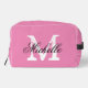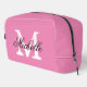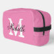 Pink ladies toiletry travel bag with chic monogram. Classy typography design template. Personalise with custom name initial. Printed on two sides.
