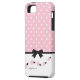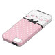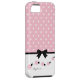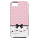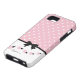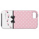 Protect your iPhone 5 in this pretty pink, white, and black case, with a real girly girl look. Graphics of a pink with white polka dot pattern, on top, and a solid white, on the bottom of the case, with a line of cute pink and black ladybugs. A black ribbon and bow runs across the middle, with custom black script text, on the bottom. Personalise this pretty case for yourself or as a great gift idea.