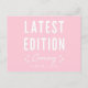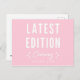 Announce a new baby girl with this humourous pregnancy announcement light pink postcard featuring the words "Latest Edition Coming" in white.
