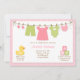 This cute Baby Shower invitation features a cute rubber duck and pink and green baby clothes, socks and bib on a laundry clothesline. This modern and elegant shower invitation is perfect for any mum to be.