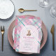 Celebrate the upcoming arrival with this adorable baby shower invitation featuring a sweet teddy bear wearing a pink bow, framed within a graceful arch design. The background highlights a light pink plaid accented with lavender and sea green, creating a fresh and cheerful palette. On the reverse side, a darker version of the plaid adds depth and contrast for a polished finish. A perfect choice for a baby girl shower, this design blends classic charm with playful, modern colour.