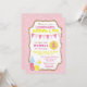 Pink lemonade birthday party invitation with cute pink and yellow banner with sunshine and lemonade glasses with straws on a pink and gold dot background. This lemonade birthday invitation is easily customised for your event by simply adding your details. This is a printed design with no real glitter, etc.