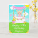 This cute and whimsical birthday card can be personalised with a name or title such as daughter, granddaughter, niece, friend etc. It features a blonde hair girl with fair skin at a pink lemonade stand which is decorated with flowers and bunting. In the background is a blue sky, sunshine and butterflies. The text combines decorative and sans serif fonts for a stylish and modern look. This is perfect for a summer birthday party.
