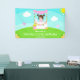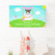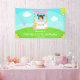 This cute and whimsical welcome banner features a brown hair girl with fair skin at a pink lemonade stand which is decorated with flowers and bunting. In the background is a blue sky, sunshine and butterflies. The text combines decorative and sans serif fonts for a stylish and modern look. This is perfect for a summer birthday party.