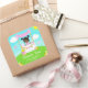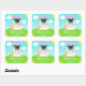 This cute and whimsical sticker features a black hair girl with dark skin at a pink lemonade stand which is decorated with flowers and bunting. In the background is a blue sky, sunshine and butterflies. The text combines decorative and sans serif fonts for a stylish and modern look. This is perfect for a summer birthday party.