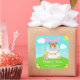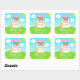 This cute and whimsical sticker features a red hair girl with fair skin at a pink lemonade stand which is decorated with flowers and bunting. In the background is a blue sky, sunshine and butterflies. The text combines decorative and sans serif fonts for a stylish and modern look. This is perfect for a summer birthday party.
