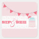 A sip and see sticker featuring an illustration of a mason jar of pink lemonade at right. Illustration of pink bunting at top. Text is pink. Look for matching party invitations at Jill's Paperie.