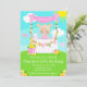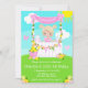 This cute and whimsical invitation features a blonde hair girl with fair skin at a pink lemonade stand which is decorated with flowers and bunting. In the background is a blue sky, sunshine and butterflies. The text combines decorative and sans serif fonts for a stylish and modern look. This is perfect for a summer birthday party.
