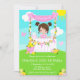 This cute and whimsical invitation features a brown hair girl with fair skin at a pink lemonade stand which is decorated with flowers and bunting. In the background is a blue sky, sunshine and butterflies. The text combines decorative and sans serif fonts for a stylish and modern look. This is perfect for a summer birthday party.
