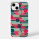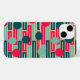 This phone case has a mid-century modern design of repeating rectangles in pink, teal, and blue with circles layered on top.