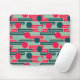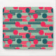 This mouse pad has a mid-century modern design of repeating rectangles in pink, teal, and blue with circles layered on top.