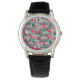This men's watch has a mid-century modern design of repeating rectangles in pink, teal, and blue with circles layered on top.