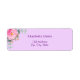 A violet, lilac coloured background. A pink rose, floral and eucalyptus greenery and faux gold foliage. Personalise and add your name and address. Purple coloured text.