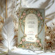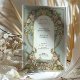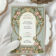 This graceful wedding invitation showcases soft pink lilies, delicate white blossoms, and pastel foliage woven into an ornate Art Nouveau frame. The floral design wraps around the central text in a refined arch, beautifully set against a soft sage green background. Inspired by the decorative elegance of the early 20th century, the intricate border details and monogrammed back design evoke a sense of timeless romance. Perfect for spring weddings, garden ceremonies, or lovers of floral vintage aesthetics. Personalise this invitation for a wedding celebration that blooms with artistic charm.