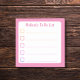 This simple pink to do list sticky notepad can be personalised with a name for a thoughtful gift. It is a small square 3x3 sticky notepad with shades of pink text and lines on a white background with an pink border. You can change the text that says "To Do List" to some other type of list if you wish. There are check boxes next to each line that can be ticked as each task is completed.