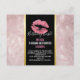 Birthday or other event postcard with a background composed of rose gold tropical leaves. Layered over top is a black frame with a gold gradient border, inside are pink glittery lips.