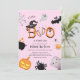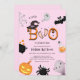 Get ready for a unique and adorable event with our most spooky Pink Little Boo Halloween Baby Shower Invitation! The enchanting pink-infused backdrop with orange and black watercolor elements and a playful ""A little Boo is almost due" saying creates an inviting and stylish atmosphere, setting the tone for a memorable baby shower and making this stunning invitation a delightful keepsake for attendees. Surround yourself by mischievous ghosts, bats, scary pumpkins, and witches as you celebrate your bundle of joy!