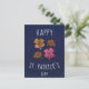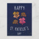 Pink Lucky Shamrock Clover Happy St. Patrick`s day Postcard. St. Patrick`s day card. Four shamrocks on navy blue background. Clovers with four leaves for the luck.