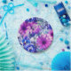 This is a blue and pink fantasy garden floral pattern of dahlias, pansies, apple blossoms and leaves.