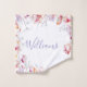 Branches with pink, purple and golden magnolia flowers. Elegant white background. Violet, lavender coloured hand lettered style script and template for your family name.