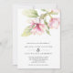 A pretty and romantic wedding invitation, in pink and green. This design features a a branch of pink and green watercolor magnolia flowers and leaves on a white background, and modern black text. The reverse is in solid pink.