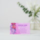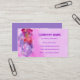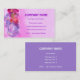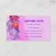 A pretty business card with a semi-abstract floral design in shades of pink, blue and mauve on a pink background, with purple lettering. The reverse is violet with white lettering. Ready for you to customize with your own details.