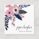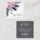Lighthearted floral business cards in a unique square format feature a spray of flowers and botanicals in shades of blush pink and forest green. Add your name and business name or title/occupation in the lower right corner. Cards reverse to white lettering on a rich grey background. Includes three social media icons and a field for your username.