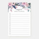Chic personalized note pad features a top border of blush pink flowers, buds and dark green botanicals. Personalize with two lines of custom text in modern block and handwritten script lettering; shown with "things to do" and your name. 11 lines with checkboxes help you keep track of all your important tasks!