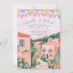 This destination wedding invitation features painted artwork of a Mexican town scene with papel picado banners on top. All the important wedding details can be personalized. Colors include green, pink, white and coral.