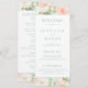 Elegant pastel pink, peach, teal floral wedding program cards showcasing delicate watercolor peonies and simple minimalist calligraphy script in mint colour. Perfect for botanical garden outdoor celebration.