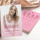 Modern and minimal typography graduation announcements with photo, fun graduation party invitation on the back in pink, red and white, Custom it with your own photo and party information.