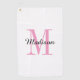 Custom printed golf towel personalised with your name and monogram initial or other custom text. Use the design tools to choose any background colour, edit fonts and colours or upload your own photos to create a unique one of a kind gift for your favourite golfer.
