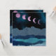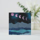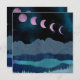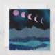 This gorgeous abstract landscape depicts a nighttime mountain scene with a bold pink moon shown in phases arcing over the sky. The design uses blue, cyan, pink, and grey colours.