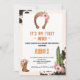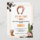 kindergarten 1st Birthday Invitation for My First Rodeo Cowboy Sweet little cowboy-themed first birthday invitation that can be customised for any age. This design has numerous cowboy-themed items, cactus, and a cowhide or cow print pattern on the back.