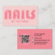This pretty and modern business card is perfect for the trendy and stylish nail technician. It features faux printed sparkly glitter dripping "nails" typography on a simple background. The colour scheme includes blush and bubblegum pink. On the back displays your business information, a scannable QR code for your customers to connect, and various social media symbols to represent the different ways your customers can connect with you when they scan your code. Contact the designer if you need any additional symbols or if you need some taken away, or for any other request.