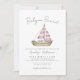 Baby On Board! Nautical Baby Shower Invitation. Celebrate the upcoming arrival of your little sailor with this simple and minimalistic nautical-themed invitation. The top features the phrase "Baby On Board!" which can be easily changed to say "Anchors Away!" if you prefer. A cute watercolor sailboat with pink and white striped sails sits just below the text, all set against a clean white background. The text is styled with a mix of handwritten script calligraphy and classic serif fonts in soft grey tones.