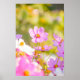 his photograph is a burst of joyful color, dominated by vivid pink Cosmos flowers basking in golden sunlight. The focus is sharp on the central bloom, where a tiny bee is actively gathering nectar, adding a dynamic moment of life to the scene. The petals range from soft lilac to electric magenta, contrasted by the warm, sun-drenched yellows and greens of the deeply blurred background. This image perfectly encapsulates the energy and vitality of a flourishing garden on a bright, sunny day.
