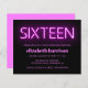 Cool budget-friendly invitation for her 16th birthday party with "sixteen" in hot pink glowing neon lights against a black background.