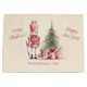 The cutest pink Nutcracker stands on Christmas Eve next to a pretty decorated holiday tree and an array of pink presents. The scene is from a vintage watercolor design. We hope you agree with us that it is so cute!