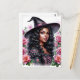 Postcard features a brown-skinned witch wearing black and pink witch outfit with pointy hat, surrounded by pink roses!