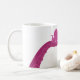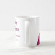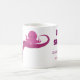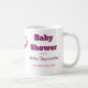 Mug with a smiling, pink, octopus character. The little octopus is being held up by the arm of a larger octopus. All of the baby shower text and information can be customised.