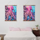 Pink Octopus Blue Ocean Wave Background Hanging Tapestry