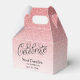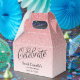 This beautiful favour box features faux pink ombre glitter and your custom text along with the word Celebrate in fancy script. Use the template form to add your information. The Customise feature can be used to change the font and the text layout. You can also add text to the other side of the favour box.